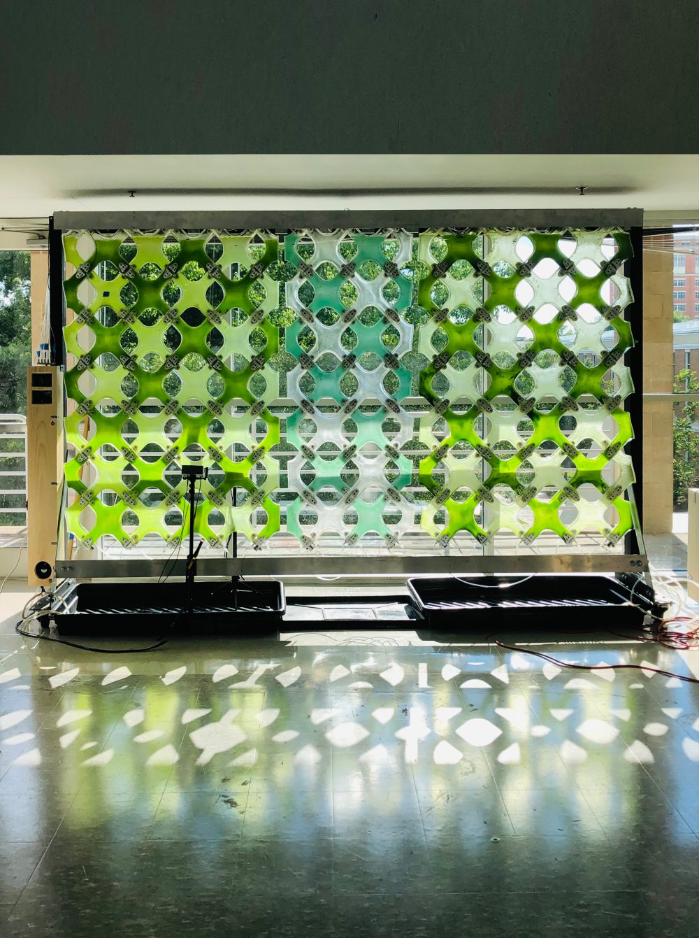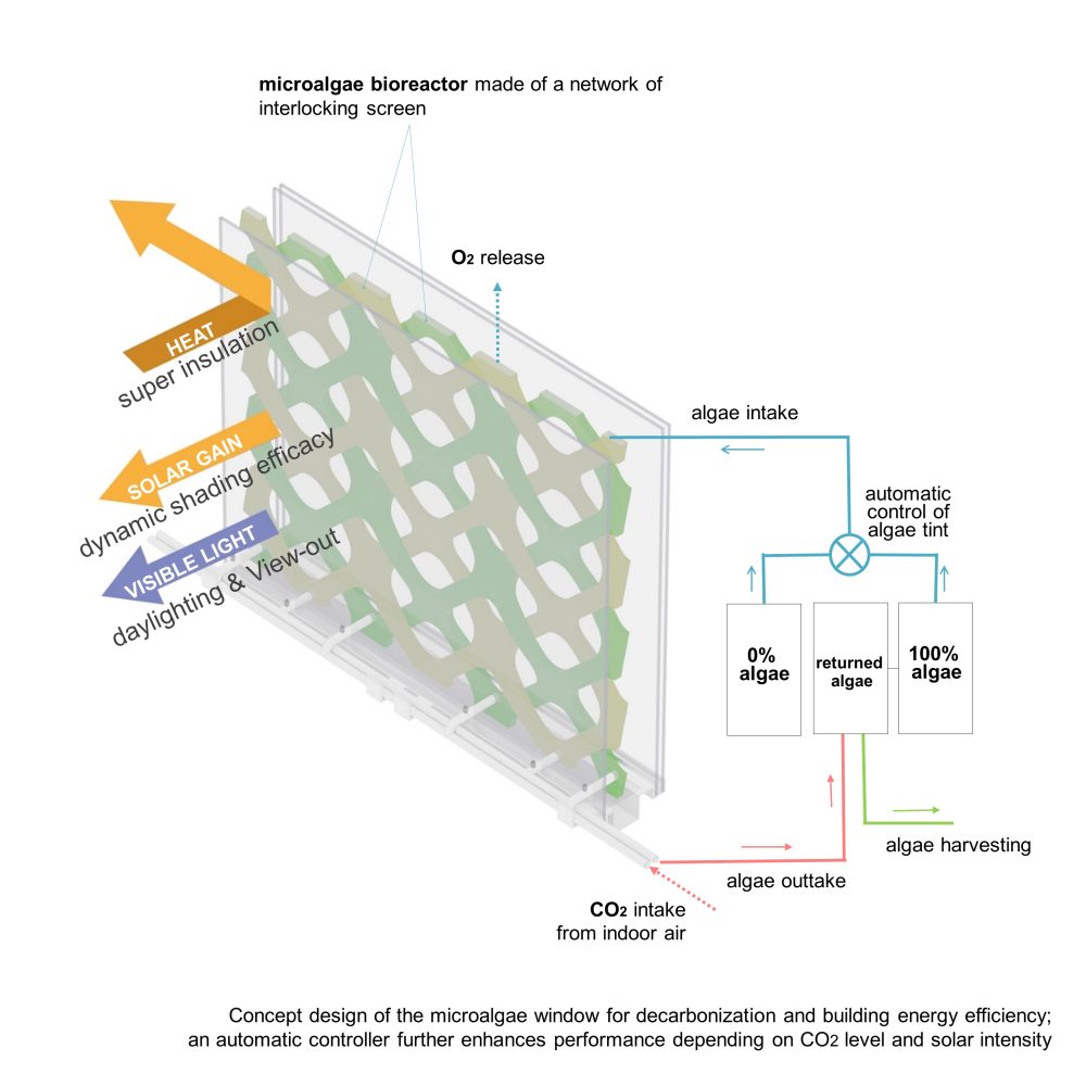 Professor of Architecture Kyoung Hee Kim began developing microalgae-filled building façade systems years ago, prompted by an environmental science class in graduate school. Knowing algae’s ability to sequester carbon and improve air quality as well as potential uses as food or energy sources, she began to design window installations in which microalgae could grow.