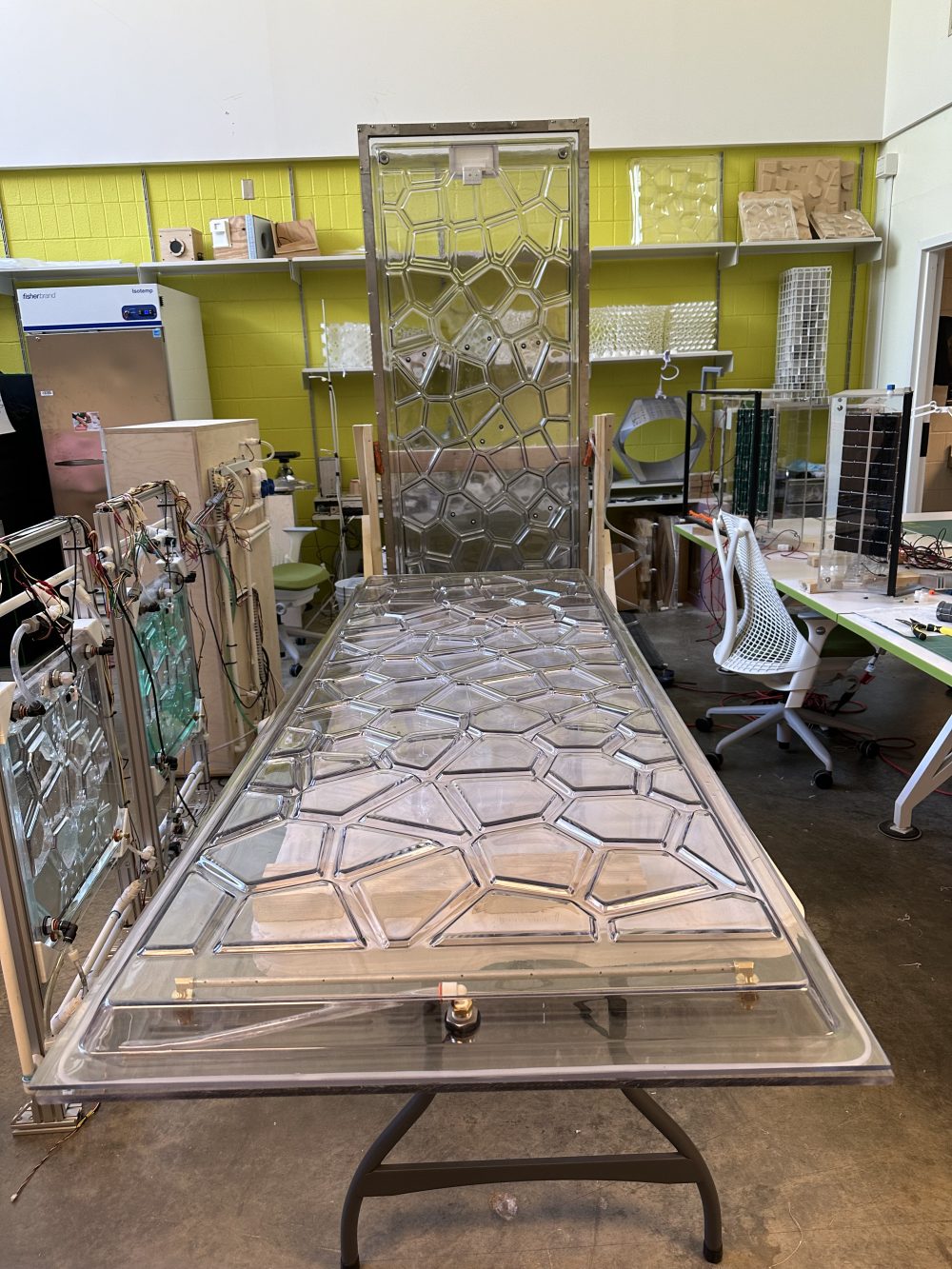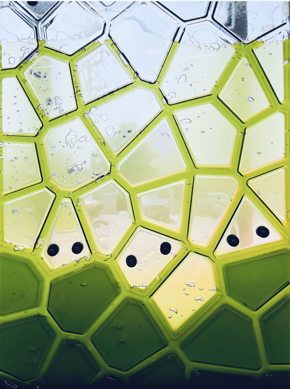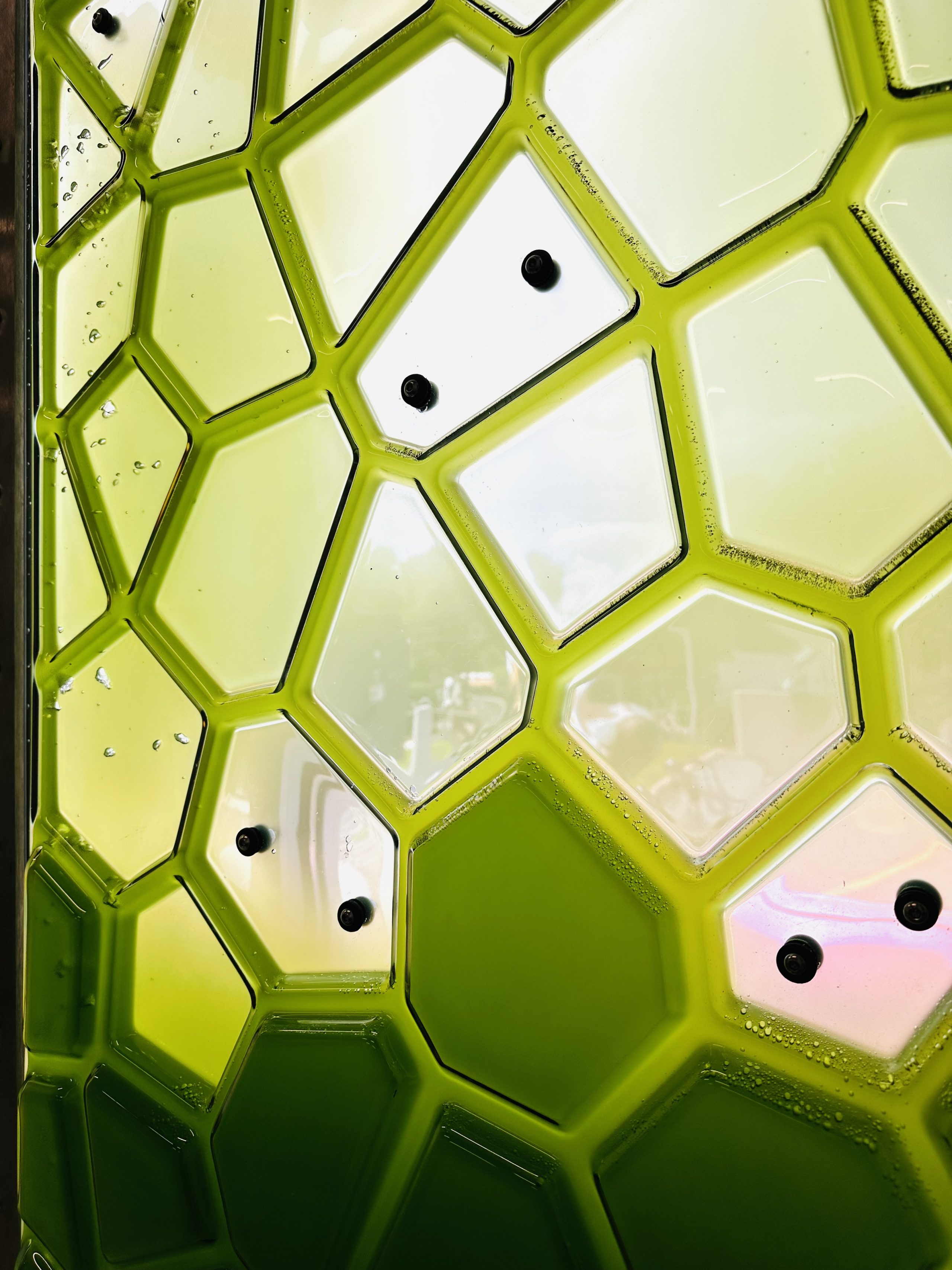 With this design, I still need to provide a view out at human eye level, to create a transparent view out. So the top and bottom of the panel are thicker, for growing more microalgae, and the middle is much thinner and translucent, transparent, for the viewing experience.